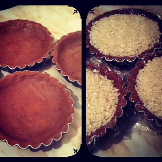 Βγάζουμε τις τάρτες μας απο το ψυγείο κ στην επιφάνεια τους στρώνουμε διαφανή μεμβράνη. Γεμίζουμε με ρύζι, φασόλια η οποιοδήποτε όσπριο για βάρος κ ψήνουμε την τάρτα μας για 15'. Τις βγάζουμε απο το φούρνο, αφαιρούμε το βάρος κ τη μεμβρανη κ ξαναβάζουμε στο φουρνο για 10'.