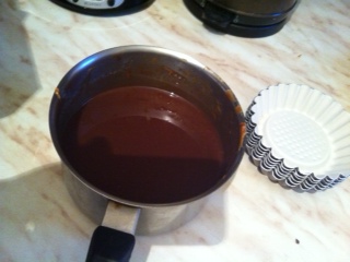 Αφήνουμε 1-2' να μαλακώσει η σοκολάτα κ ανακατευουμε με μια σπατουλα να λιώσει εντελώς η σοκολάτα μας .